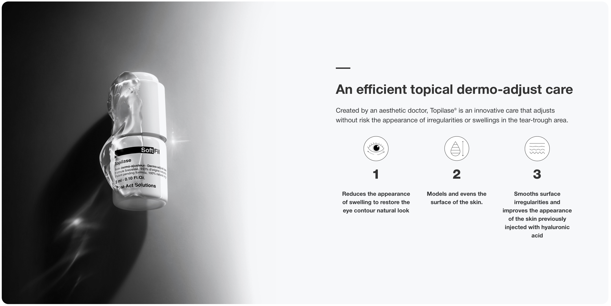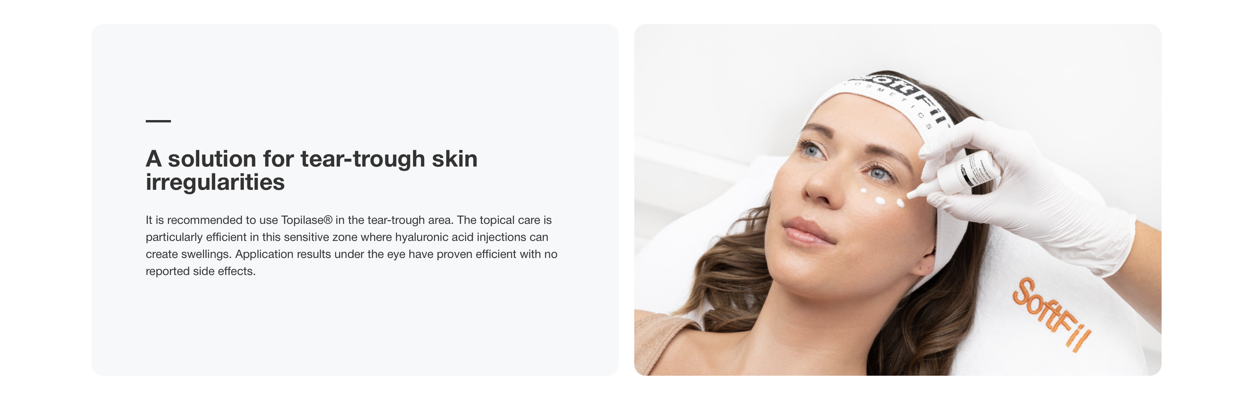Topilase® is a topically applied cosmetic that improves the appearance of skin injected with hyaluronic acid. Topilase® can be massaged onto the skin to reduce the appearance of irregularities caused by hyaluronic acid injections. The use of Topilase® is recommended in the periorbital area.